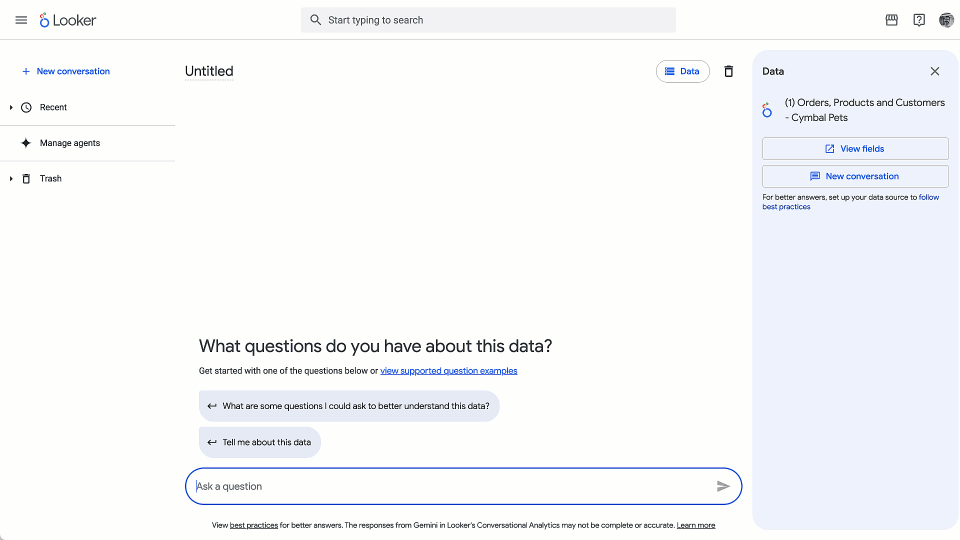 Đối thoại trực tiếp với dữ liệu: Cho phép người dùng giao tiếp bằng ngôn ngữ tự nhiên với dữ liệu Looker Explore hoặc với một data agent tùy chỉnh. Tính năng này hoạt động trong cả phiên bản Looker (original) và phiên bản Looker (Google Cloud core), hỗ trợ kết nối tối đa 5 Explores.